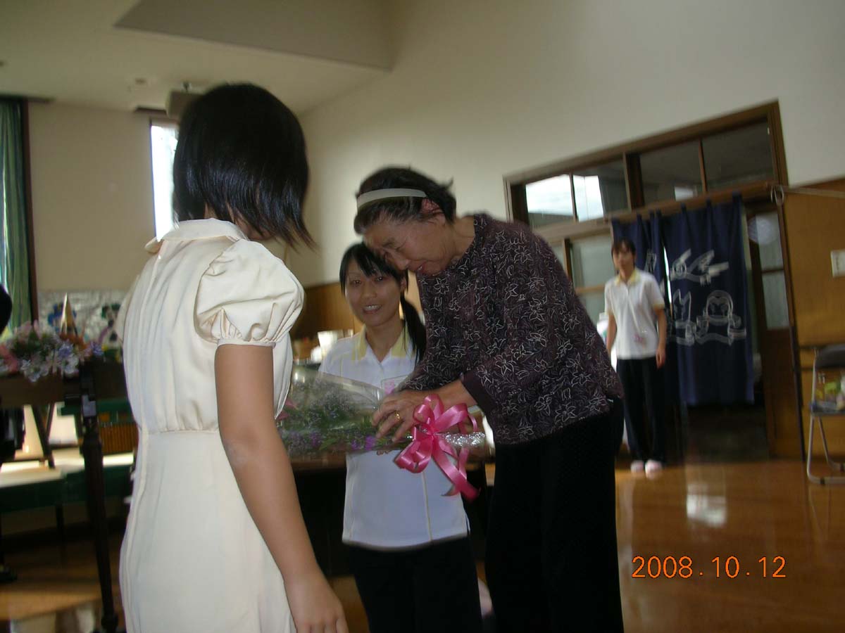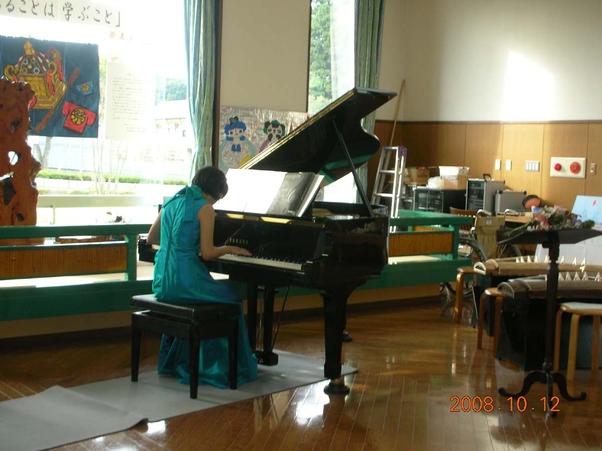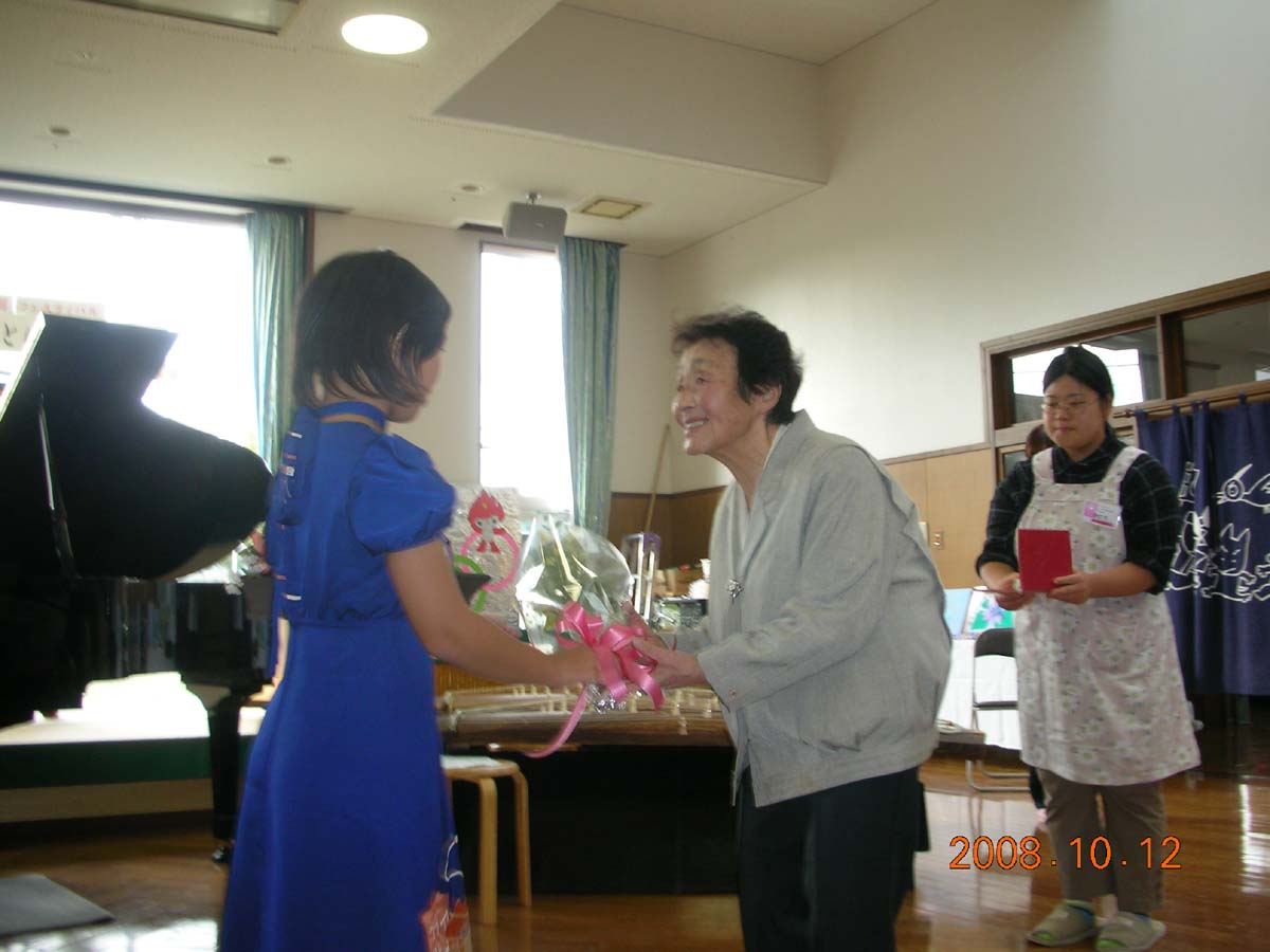 プログラムは午前中に作品鑑賞と小品づくりをし、午後にピアノやフルートのコンサートと作品賞受賞者の表彰式が行われました。 以下はその様子です。クリックすると大きな写真が出ます。 作品を見ながらお抹茶とお菓子をいただきました。 お抹茶をいただいている間、お琴の生演奏が入りました。 石に絵を描いて、小さな作品を作りました。 作品賞の受賞者に賞状と花束が贈られました。 リハーサルの間にピアニストと談笑する参加者。 良い交流ができました。 ピアノコンサート。 曲目はアラベスク(ドビュッシー)と幻想即興曲(ショパン)でした。 会場参加者から花束をいただきました。 最後に皆で合唱して、お開きになりました。 おまけ。 当日福島市内は秋祭りの最中でした。 宿へ向かう途中で行き会ったので思わず一枚。(笑)